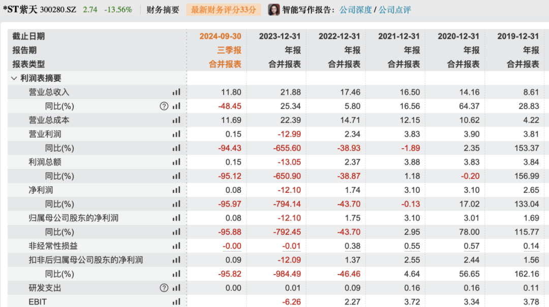 公开资料显示,*ST紫天主营业务为现代服务业务和批发零售业,具体包括互联网广告业务、云服务业务和电商贸易业务。*ST紫天在2024年半年报中表示,自2018年5月从事现代广告服务业务以来,公司广告营业收入逐年上升且具备一定的行业规模。但2023年*ST紫天业绩突然“变脸”,净利润大幅下滑。