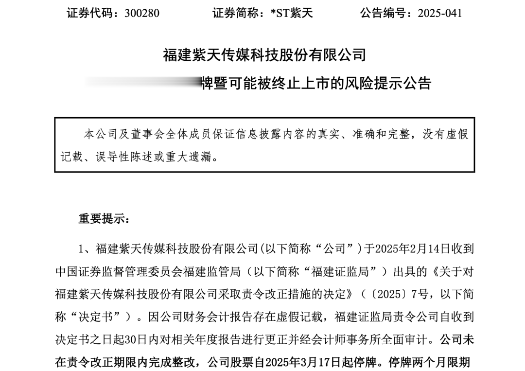 此外,因未在法定期限内披露2024年年度报告,*ST紫天及相关人员收到福建证监局出具的《行政处罚事先告知书》。