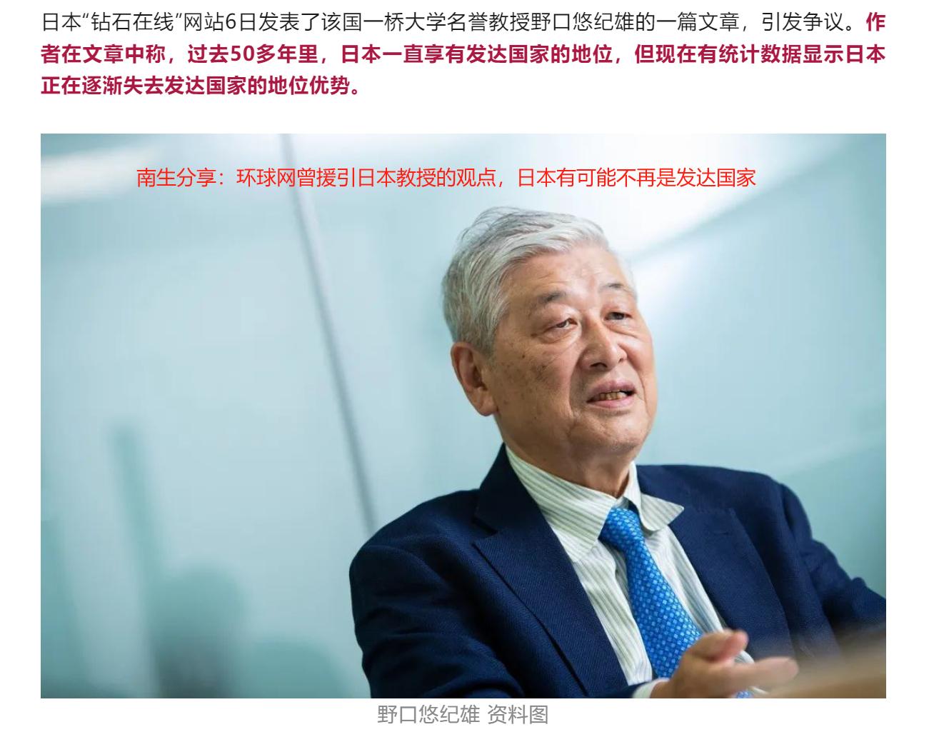 野口悠纪雄教授在文章中还提到:过去50多年里,日本一直享有发达国家的地位,但现在有统计数据显示日本正在逐渐失去发达国家的地位优势。